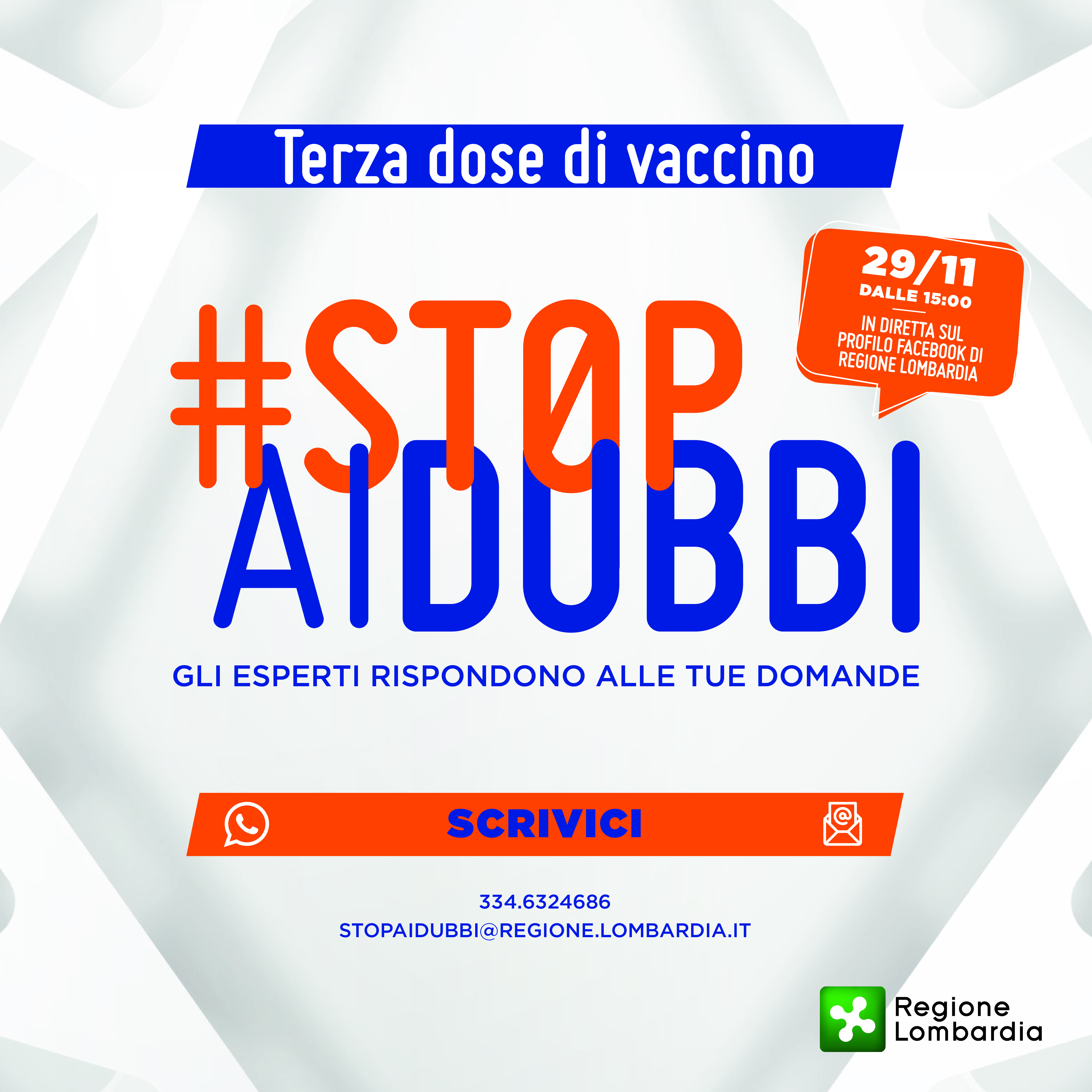 Lunedì 29 novembre dalle ore 15:00 alle ore 17:00, in diretta Facebook verrà trasmesso “#STOPAIDUBBI: Terza dose di vaccino: Gli esperti rispondono alle tue domande”.