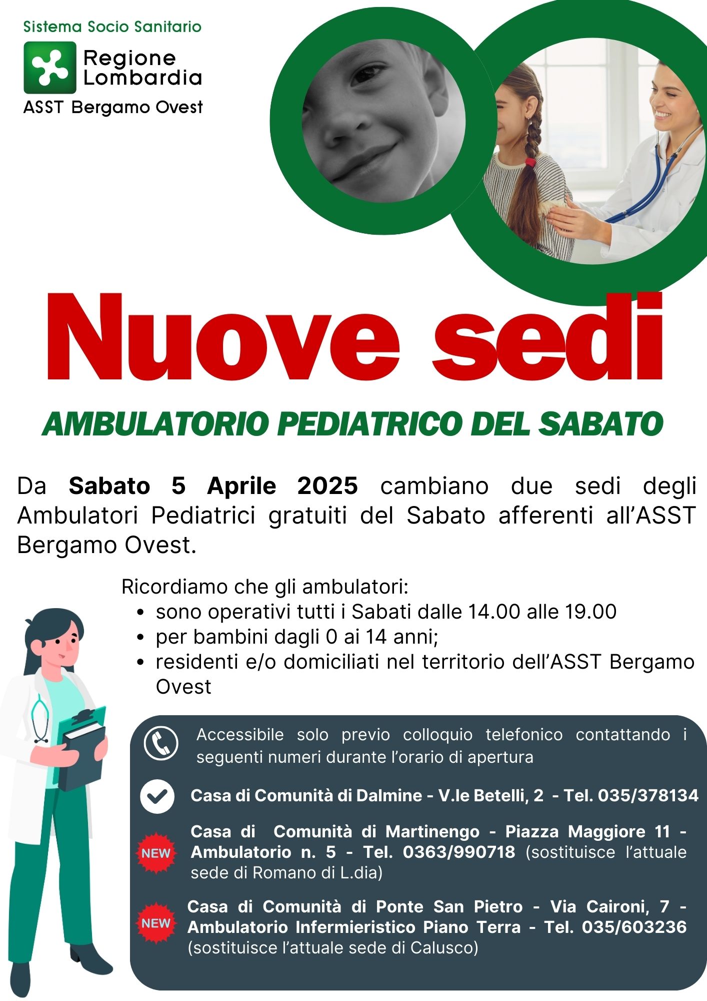 L’ASST Bergamo Ovest informa i cittadini che l’Ambulatorio Pediatrico del Sabato è aperto, nelle sedi sotto indicate, tutti i Sabati, sempre previo colloquio telefonico, dalle ore 14.00 alle ore 19.00.