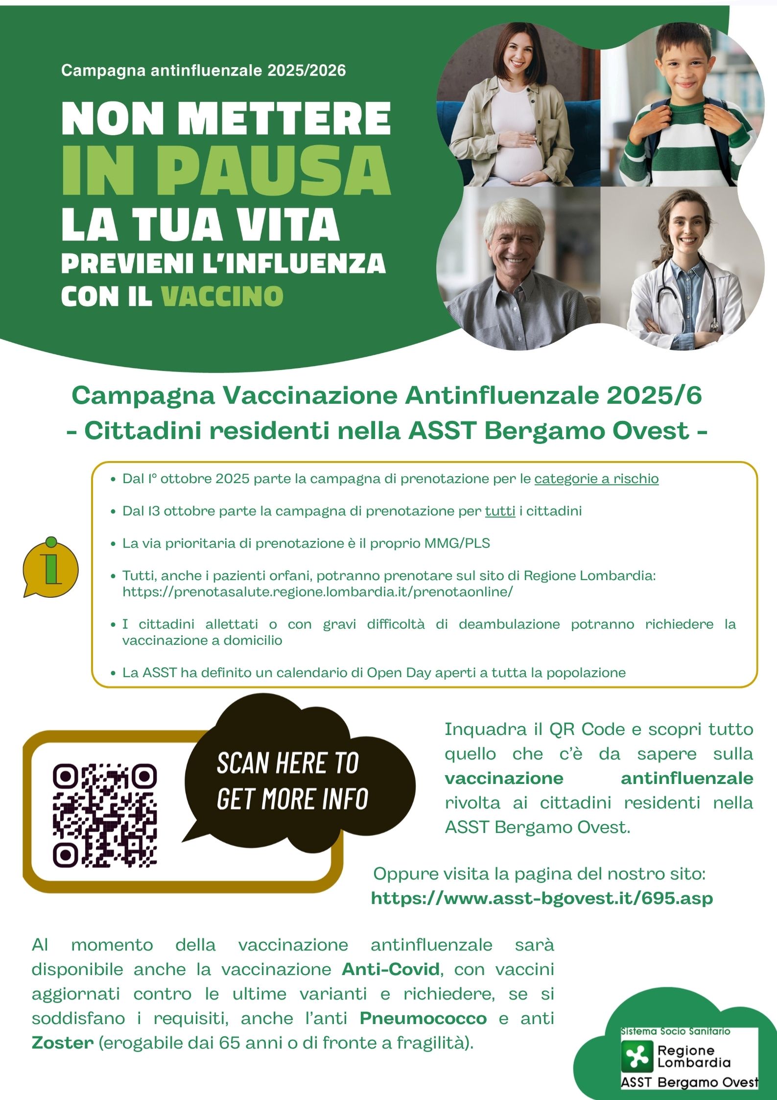 A partire dal 13 ottobre 2025 la vaccinazione è disponibile gratuitamente per tutti. I cittadini allettati o con gravi difficoltà di deambulazione, impossibilitati a recarsi presso un centro vaccinale, potranno rivolgersi al proprio medico di medicina generale per l’attivazione della vaccinazione domiciliare oppure, in caso di pazienti “orfani” potranno scrivere a vaccinazioni_domiciliari@asst-bgovest.it (specificando: i dati del cittadino, la patologia e inserendo un numero di telefono di riferimento del soggetto o del caregivers per concordare l’appuntamento).