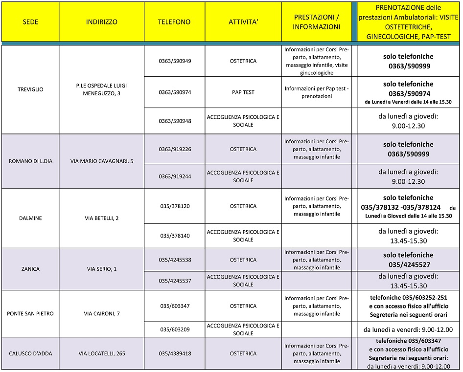 Attualmente i Consultori familiari della ASST di Bergamo Ovest sono attivi nelle sedi di:
